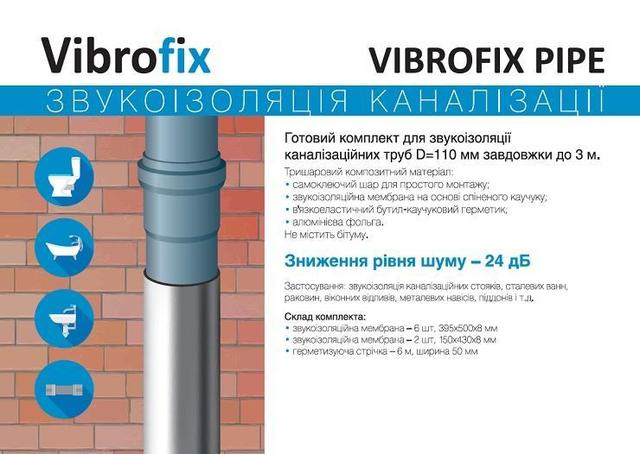Набір звукоізоляції каналізаційних труб і вузлів Vibrofix Pipe це зручний комплект спеціальних матеріалів, з допомогою яких можна самостійно звукоізолювати каналізаційні стояки діаметром D=110 мм і довжиною до 3 м.